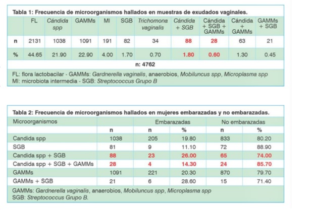 También se detectó que 28 pacientes presentaron infecciones mixtas por Candida spp + S. agalactiae + complejo GAMMs (0,60%), con 4 casos de pacientes embarazadas (14,30%).