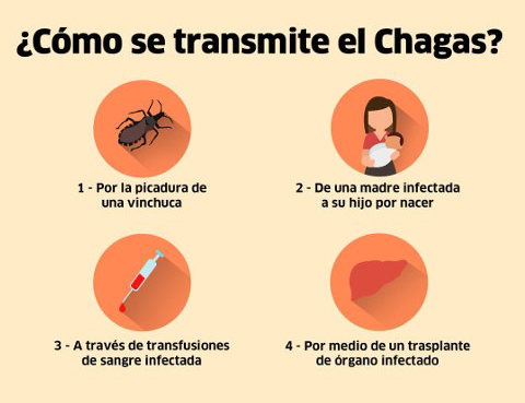 La forma más frecuente de contagio es a través de la picadura de la Vinchuca (también conocida en algunas regiones del Norte del país como Chinche). Este insecto, al picar y luego defecar, provoca una picazón en la piel de la persona que al rascarse permite ingresar al parásito al torrente sanguíneo.